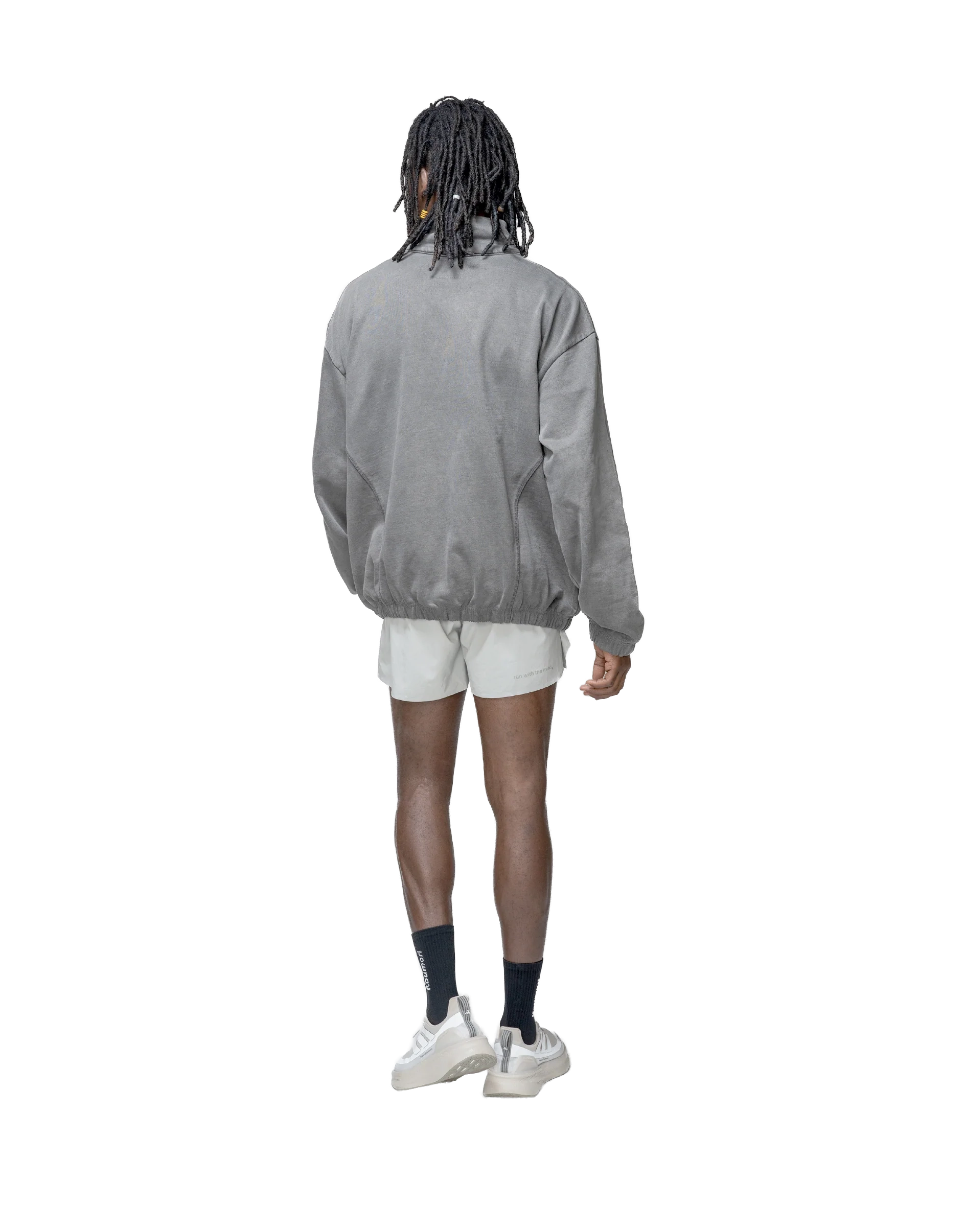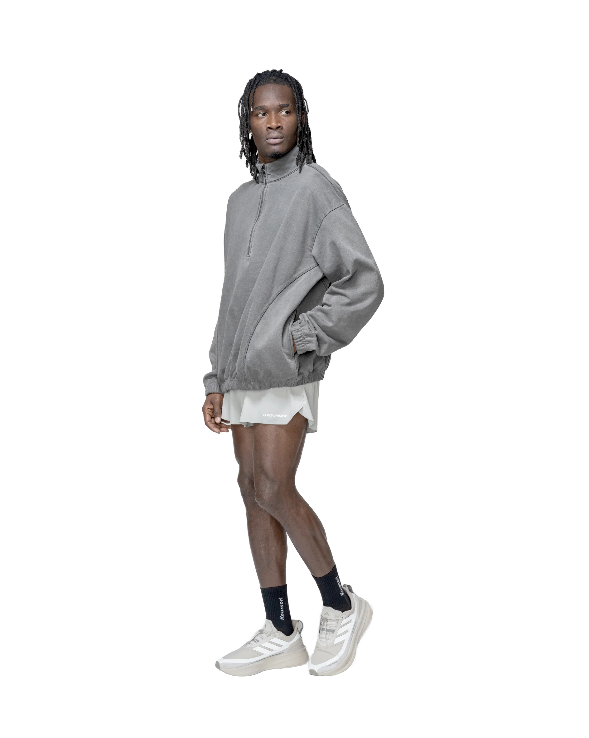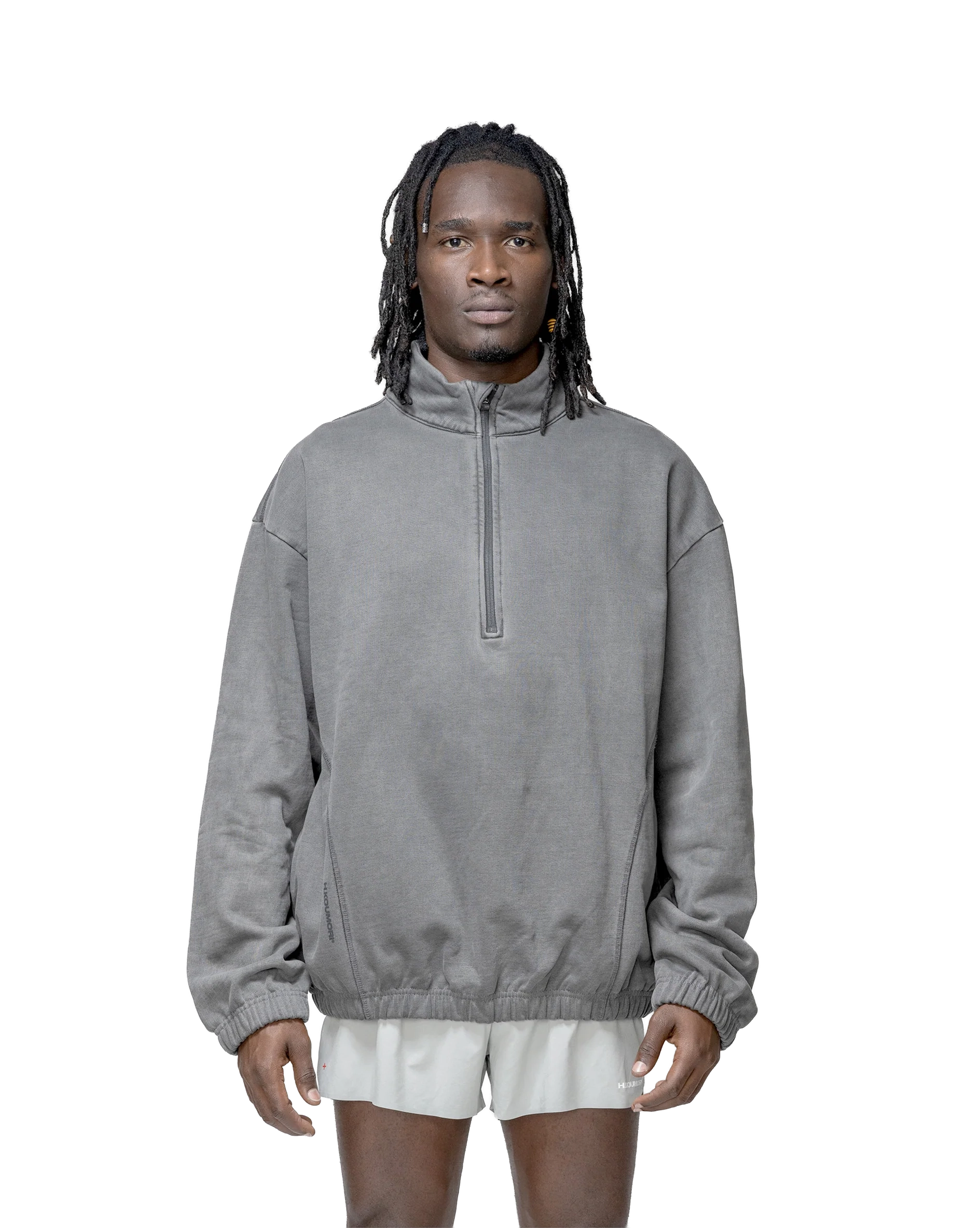 The Half Zip Crewneck in washed black is made from premium cotton, combining a smooth texture with breathable comfort. Designed with a regular fit, it features a high collar and a half-zip closure for adjustable ventilation. The H.KOUMORI®. logo on the chest adds a subtle visual detail. Ideal for layering, this piece offers versatility and comfort in transitional conditions.