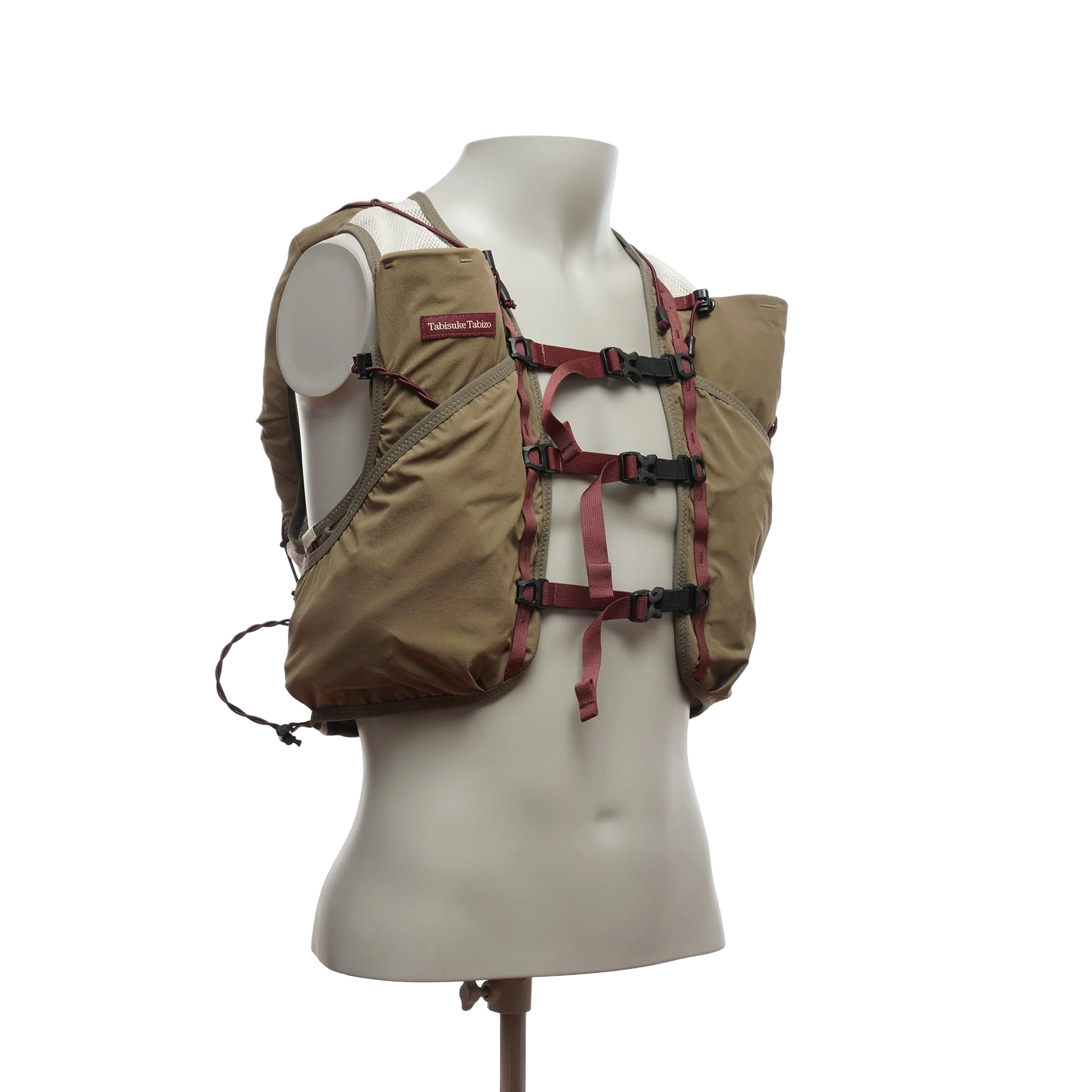 The front features flask pockets equipped with compression cords to reduce bounce and prevent soft flasks from sagging, enhancing stability while running. Two large pockets on the left and right sides provide additional storage for nutrition and small essentials. At the rear, a shell pocket allows quick access without removing the vest, and a kangaroo pocket accommodates a 250 mL soft flask. In addition to the main storage compartment, the vest is equipped with a total of eight pockets.