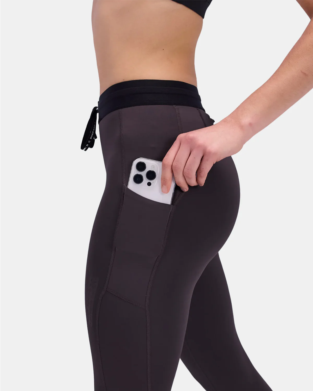 Including our signature custom developed elastic with branded drawstring and equipped with 5 pockets: 2 pockets, one on each thigh designed for iPhone, with waterproof liner; 2 gel pockets, and 1 iPhone sized zipper pocket at center back.